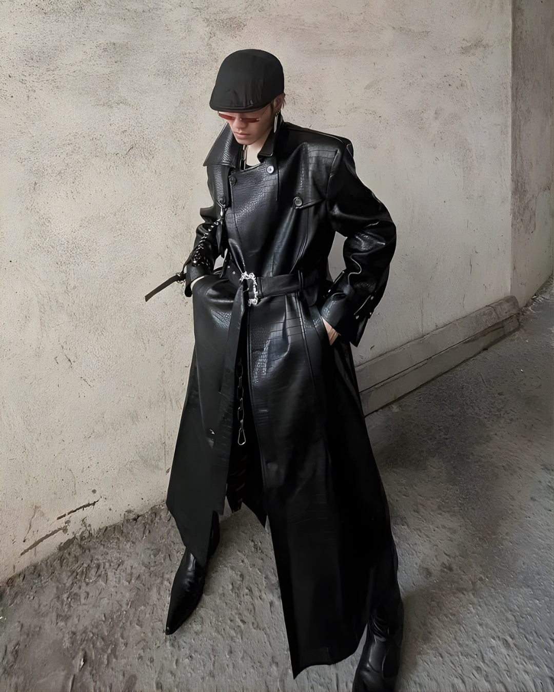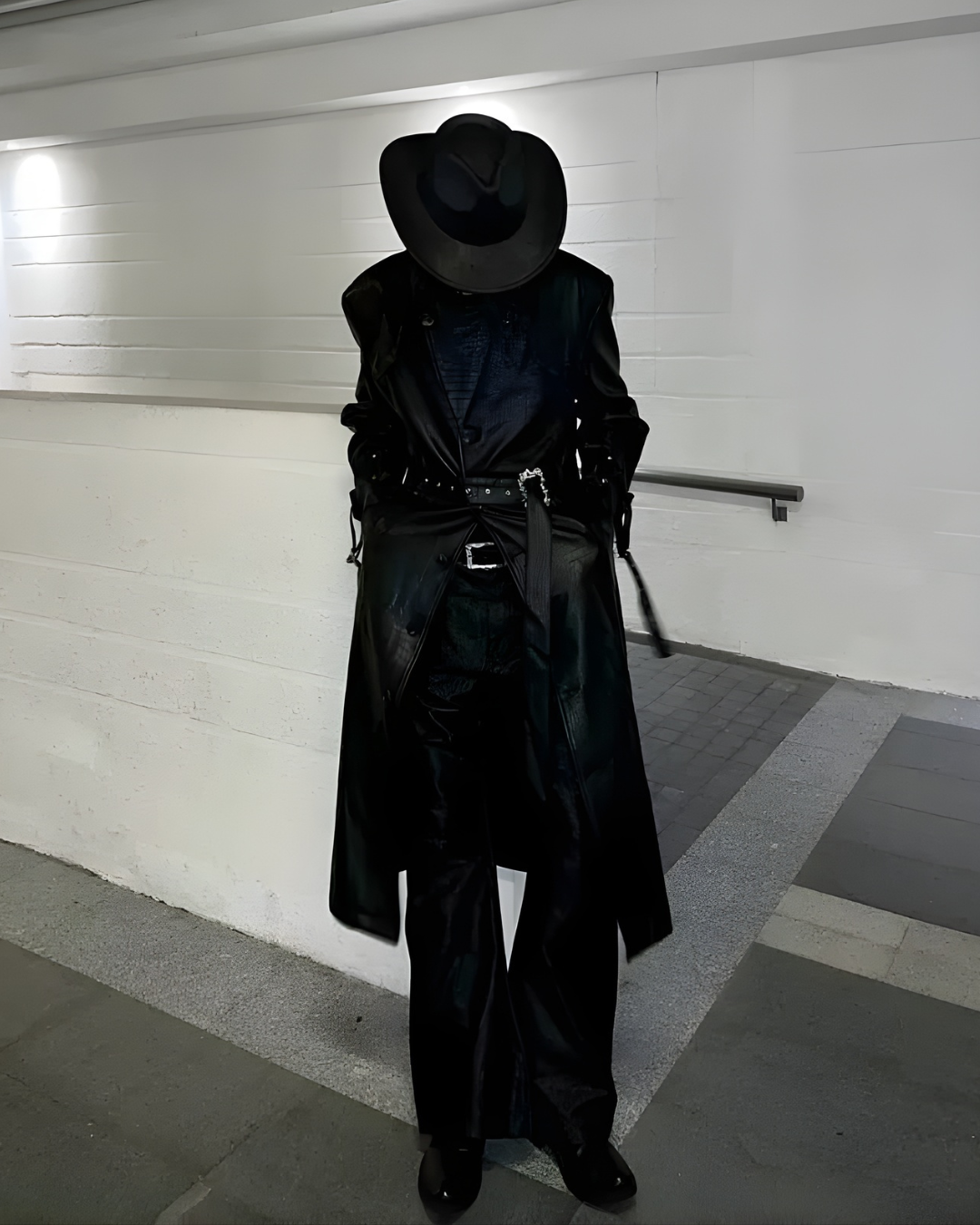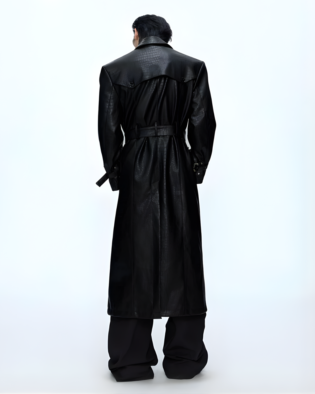 long black leather or faux-leather trench coat