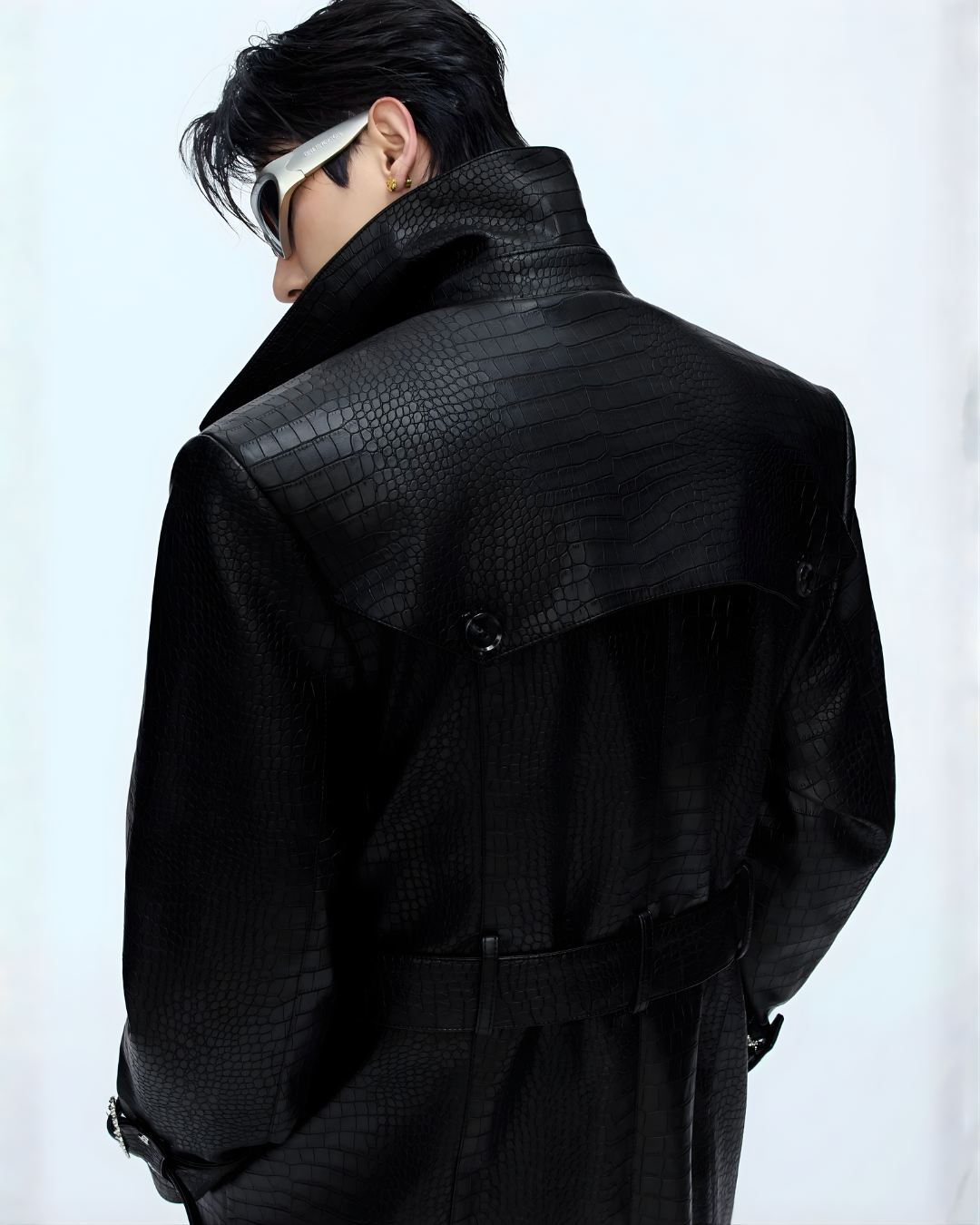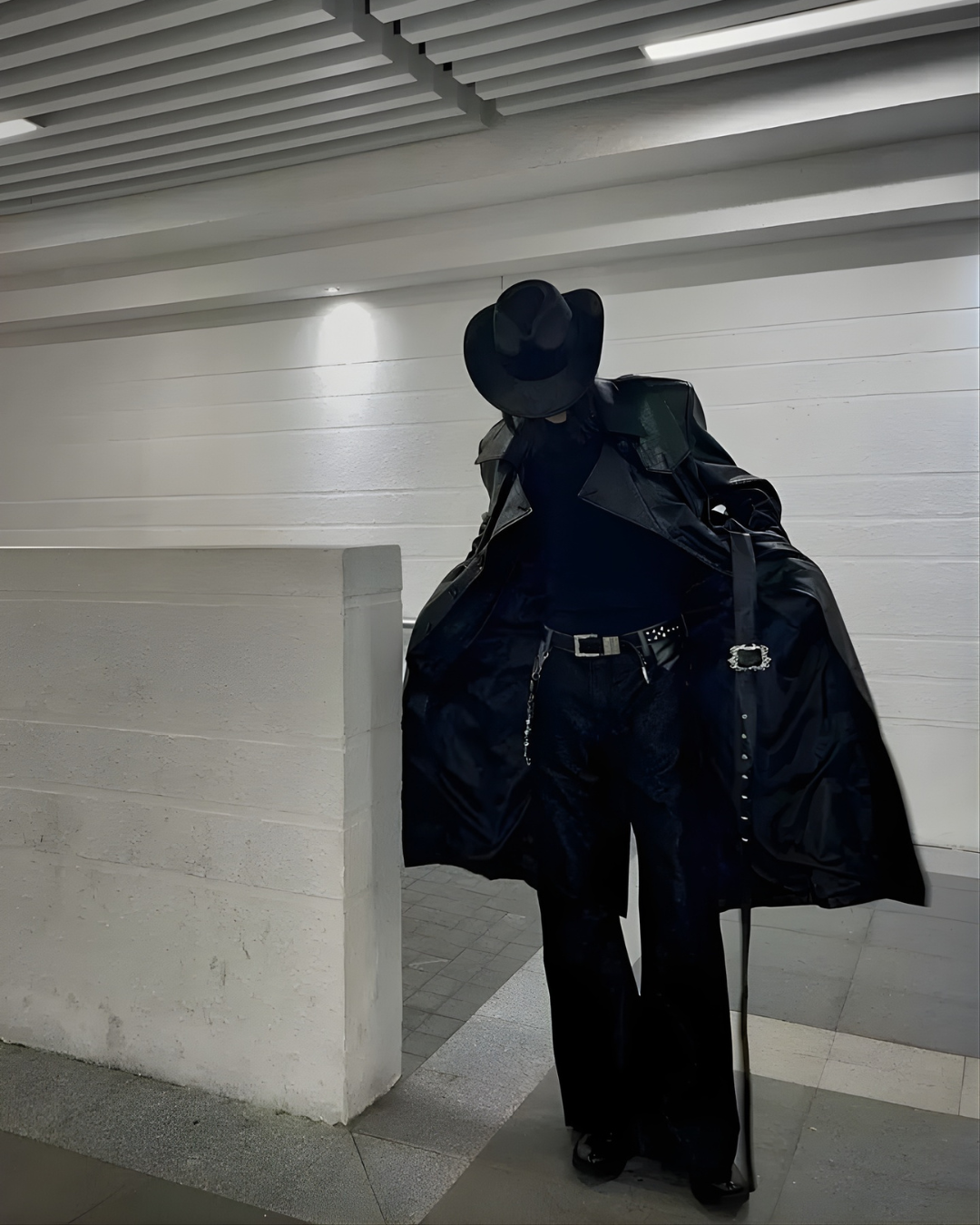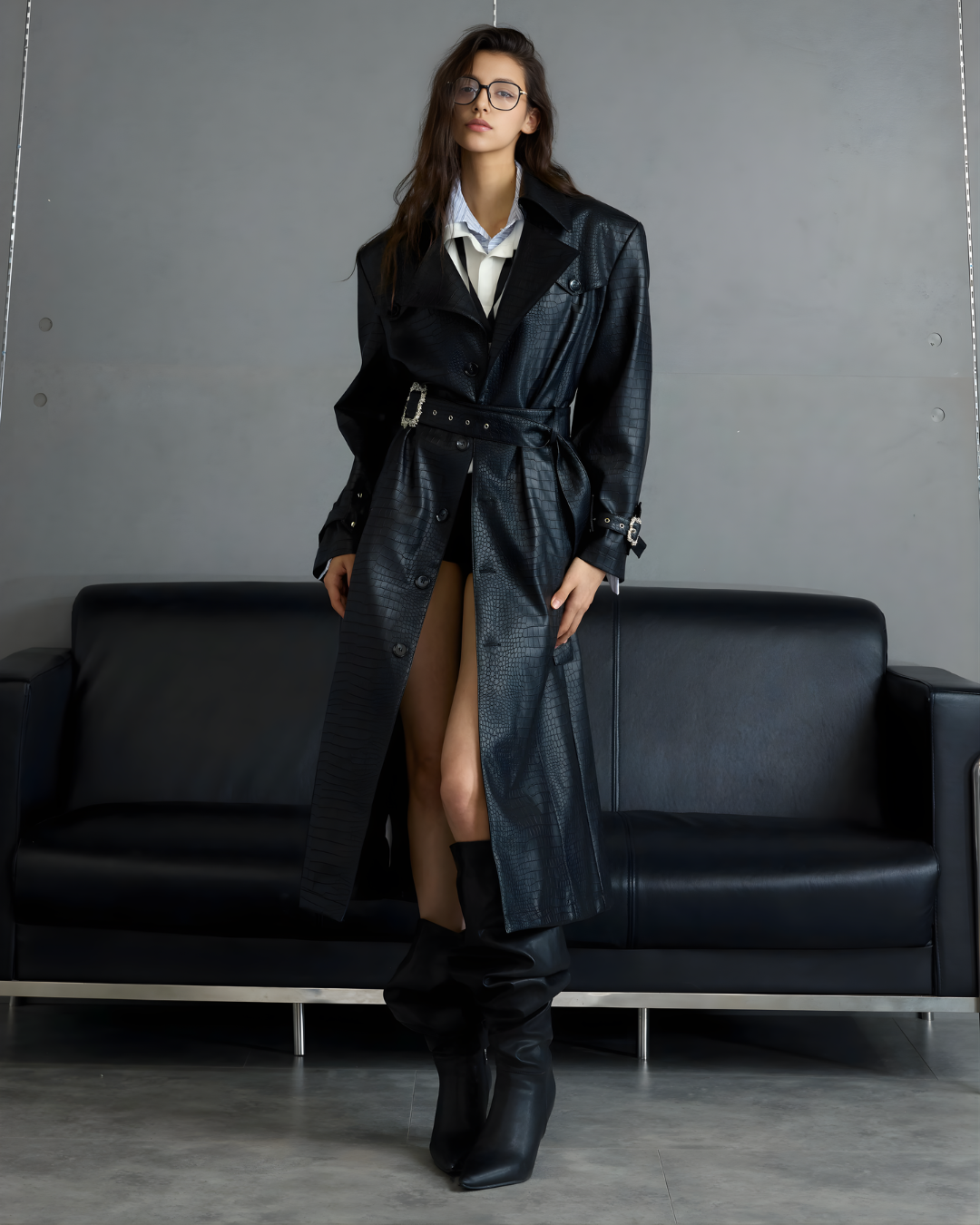 long black leather or faux-leather trench coat